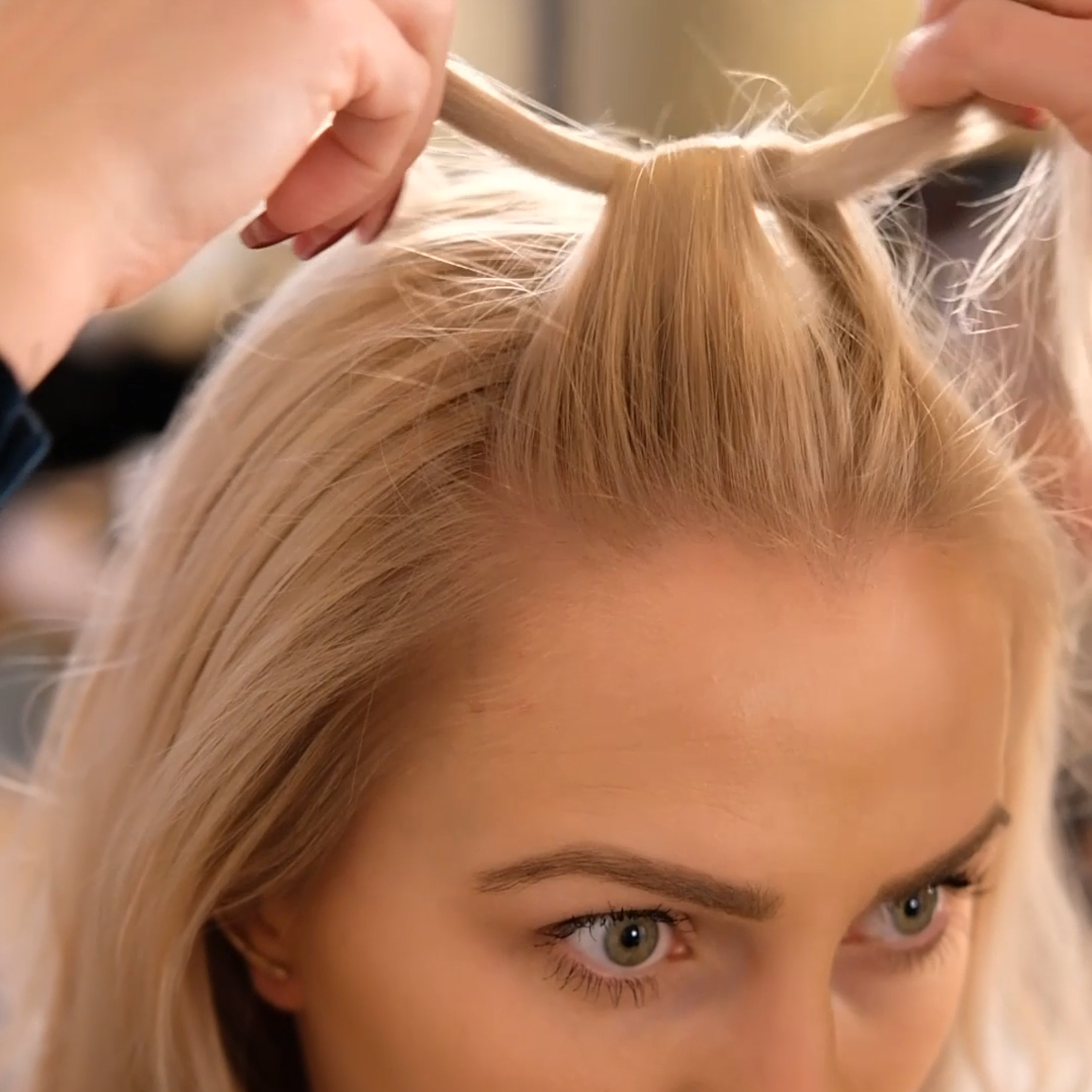 För att skapa denna flätlook behöver du faktisk tinte göra en enda fläta. Istället skapar du frisyren genom en enkel knytteknik som kan varieras på många olika sätt. Prova dig fram och hitta din variant.