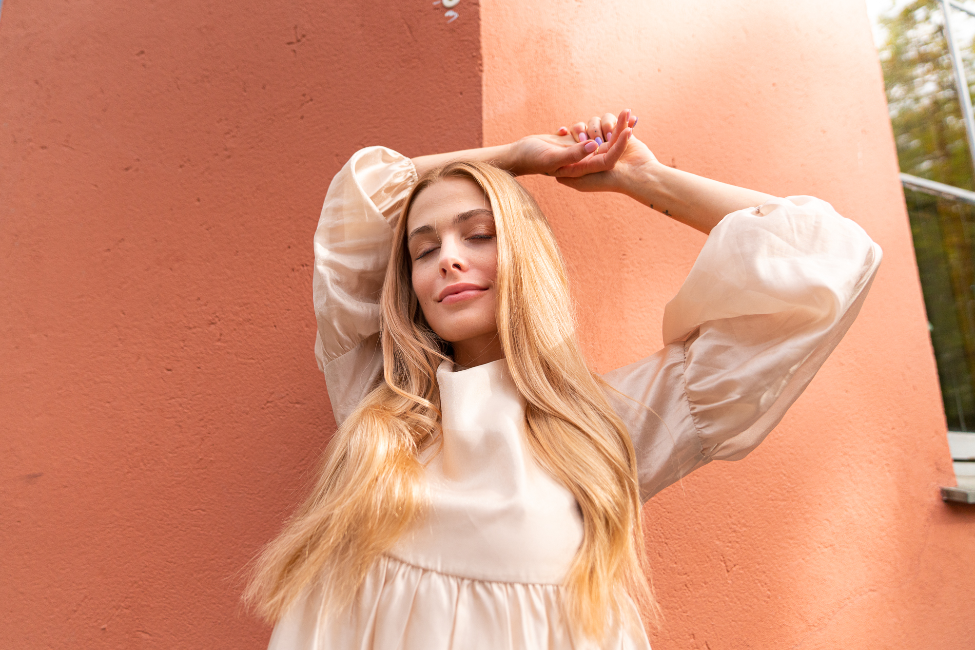 Styling. För att ge håret extra stadga använder vi en ”foaming flow” (fönkräm). För att undvika statiskt hår, ge håret ett extra lyft och förbereda det för styling använder vi Texturizing Mousse. Vi önskar att behålla Siljes naturligt raka hår och lockar det därför bara försiktigt och ”tillfälligt” med GHD Curve Curl Wand – en oval locktång, formad som en stav. Vi avslutar med att spraya hela håret med ett torrschampo för att ge det stadga och volym och reder försiktigt ut längderna. Stylingen är inspirerad av 90-talets lekfullhet mixat med dagens Instagram trender à la Kim Kardashian.