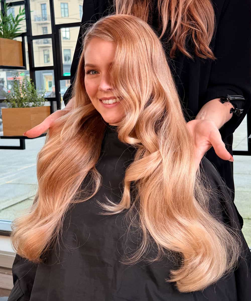 En modern blond ton med en subtil rosabeige nyans. Den här färgen ger håret ett mjukt och exklusivt uttryck.
